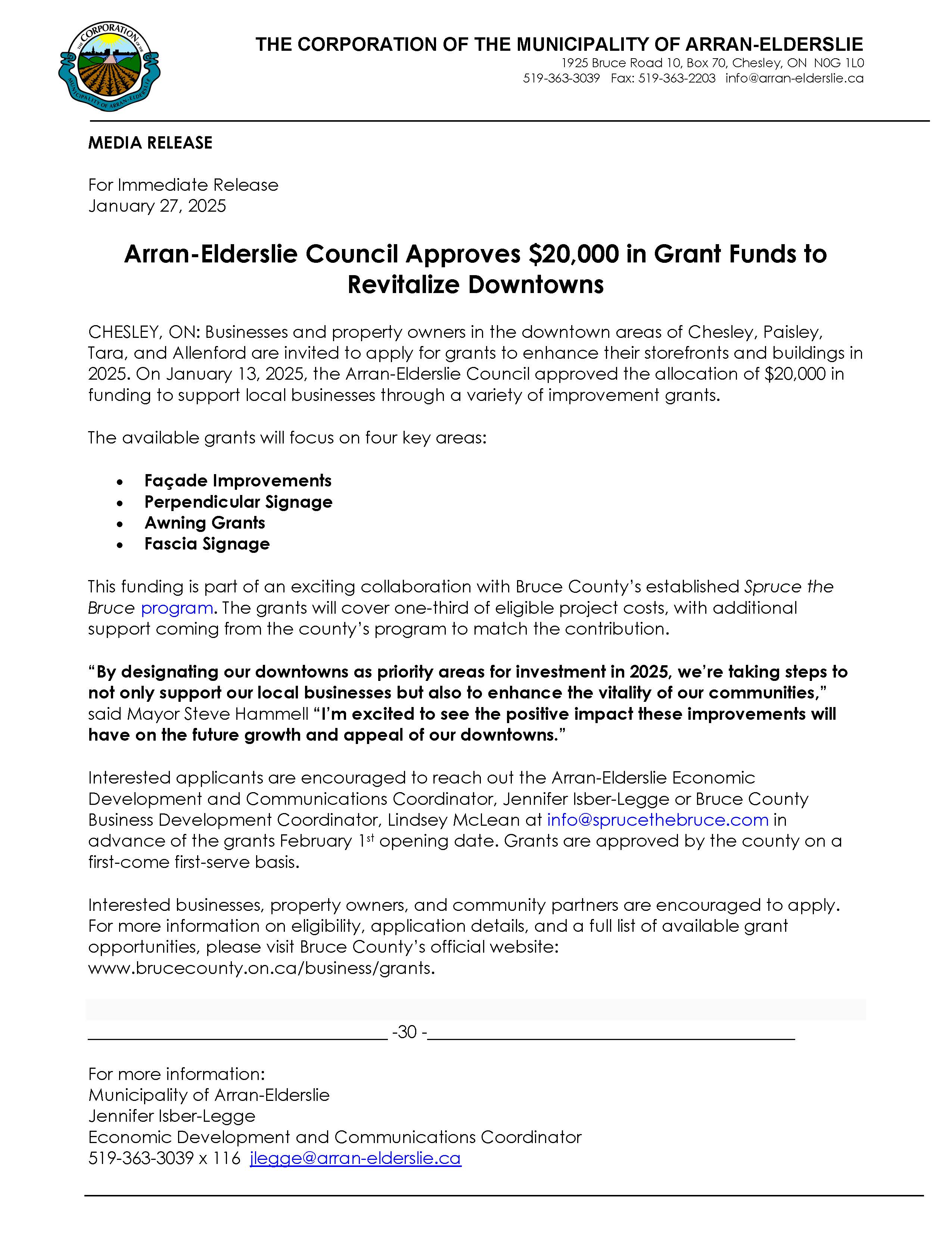 Arran-Elderslie Council Approves $20,000 in Grant Funds to Revitalize Downtowns