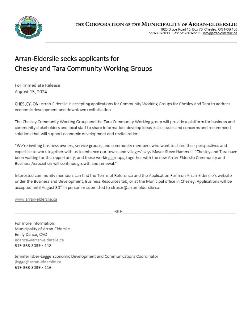 Arran-Elderslie seeks applicants for Chesley and Tara Community Working Groups