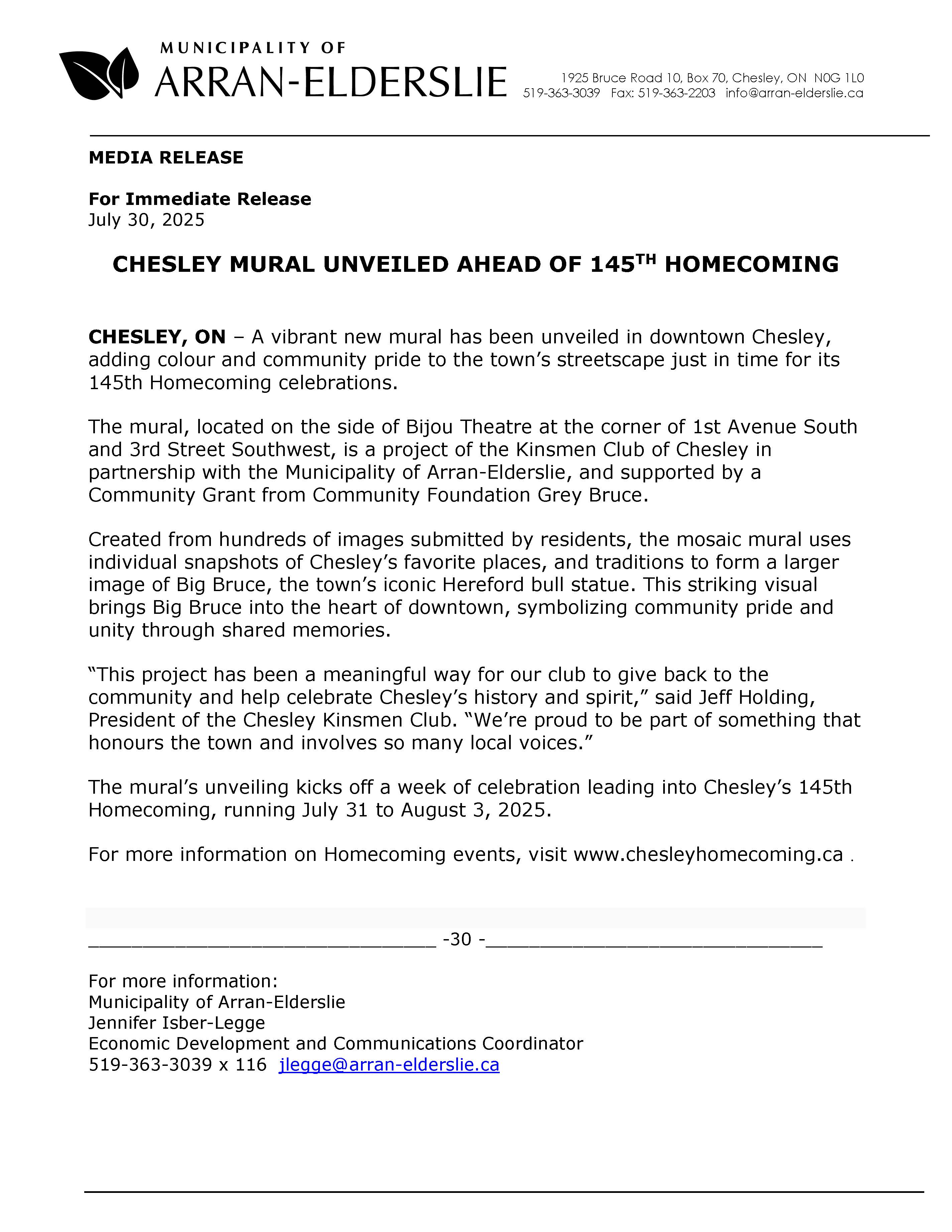CHESLEY MURAL UNVEILED AHEAD OF 145TH HOMECOMING
