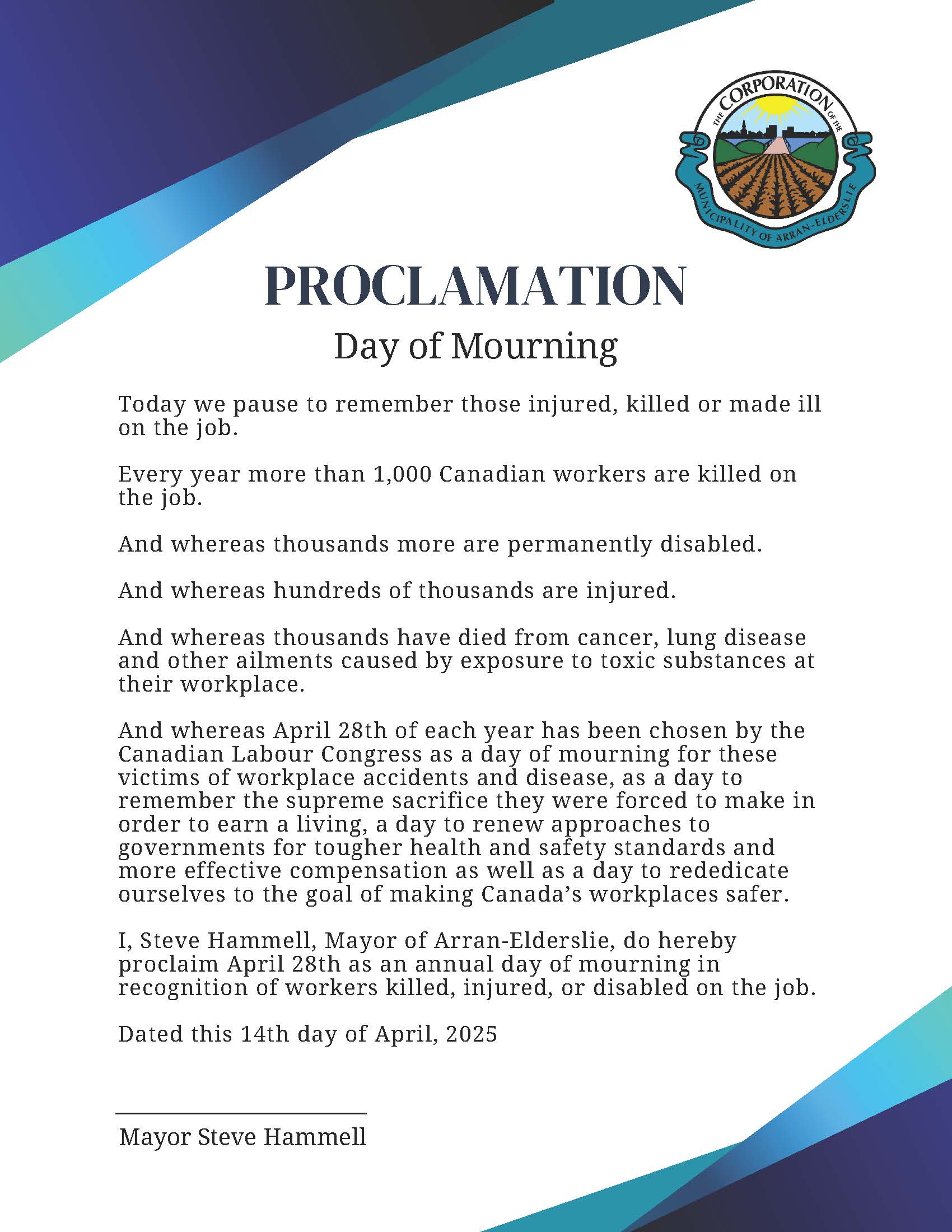 The below proclamation was made during the Municipality of Arran-Elderslie Council meeting on April 14, 2025.