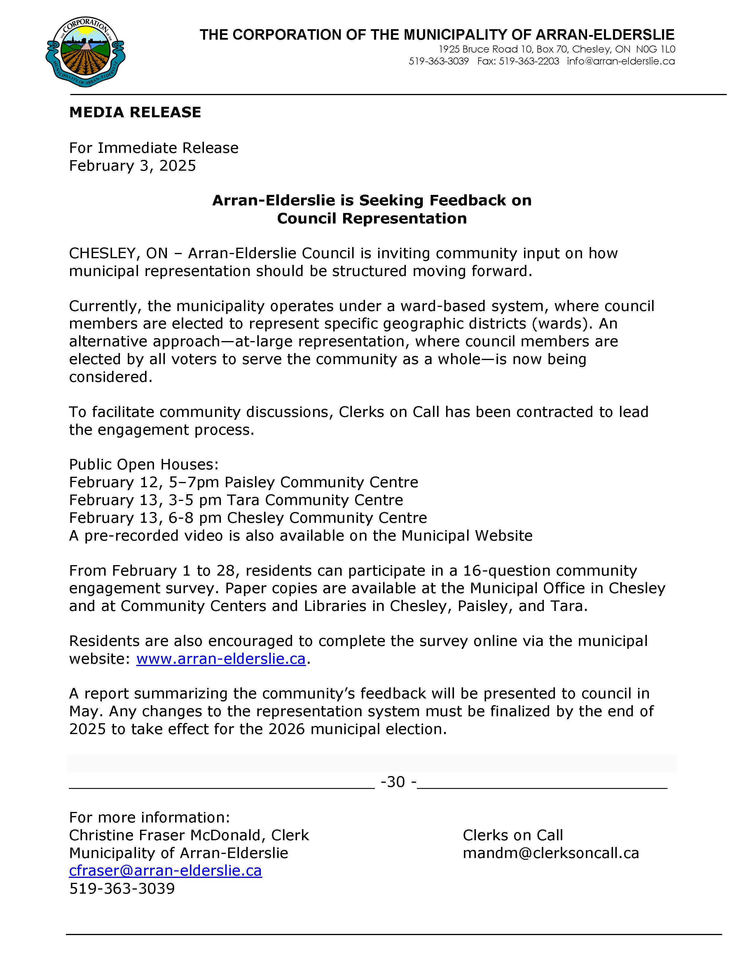 Media Release: Arran-Elderslie is Seeking Feedback on Council Representation