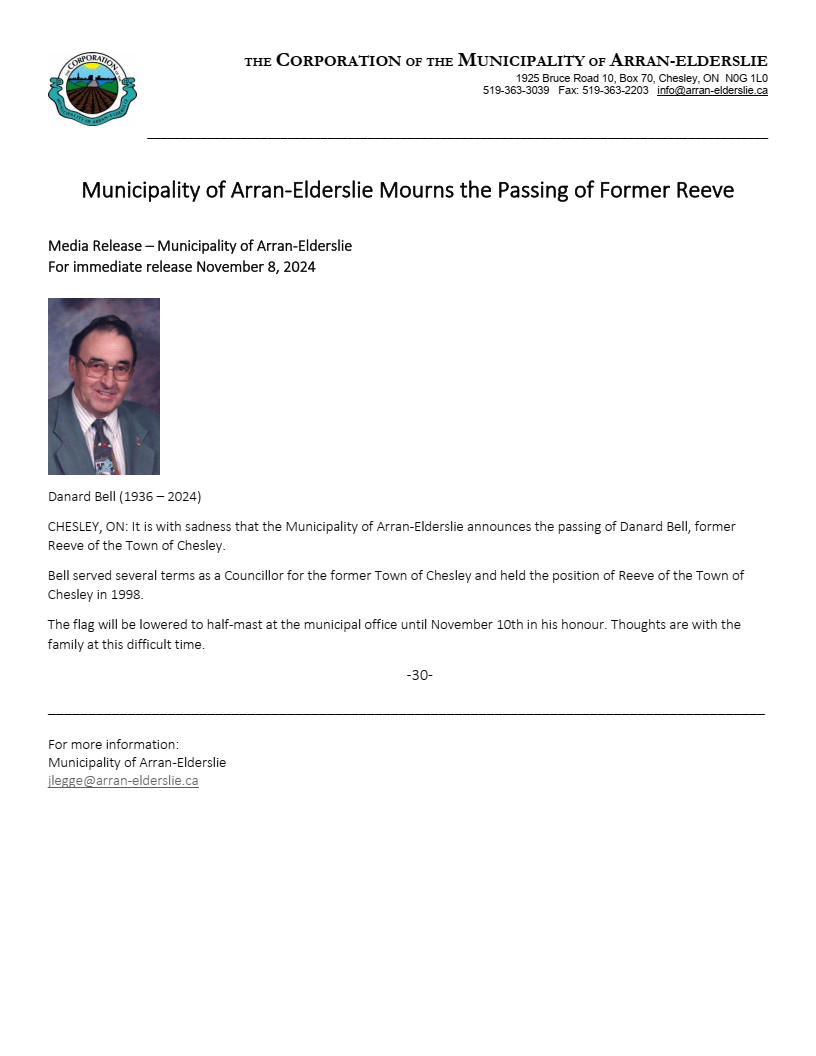 Municipality of Arran-Elderslie Mourns the Passing of Former Chesley Reeve