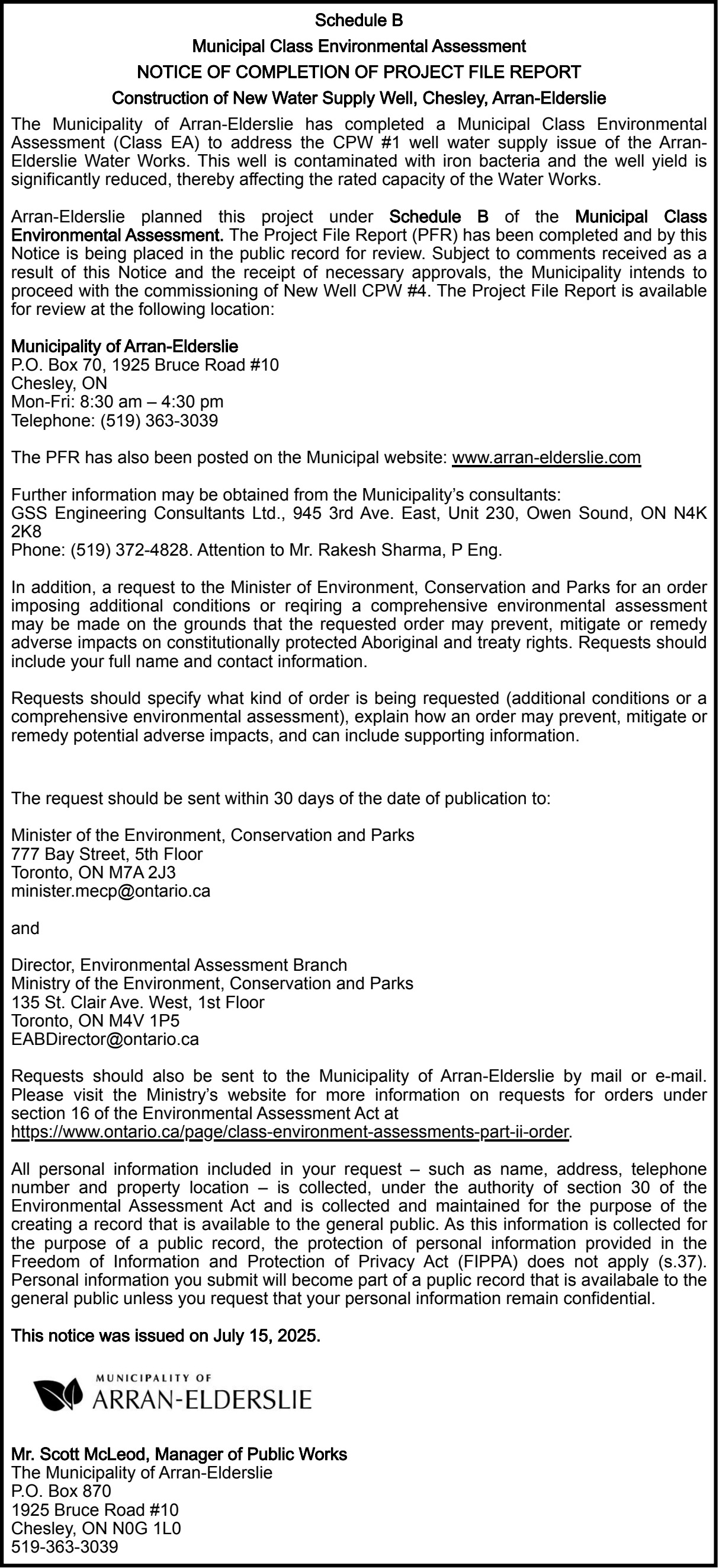CONSTRUCTION OF NEW WATER SUPPLY WELL, CHESLEY, ARRAN-ELDERSLIE
