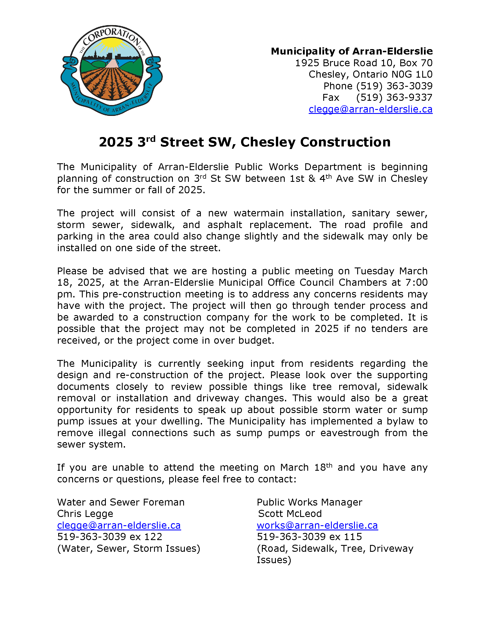 Notice of Public Meeting - 2025 3rd Street SW, Chesley Construction