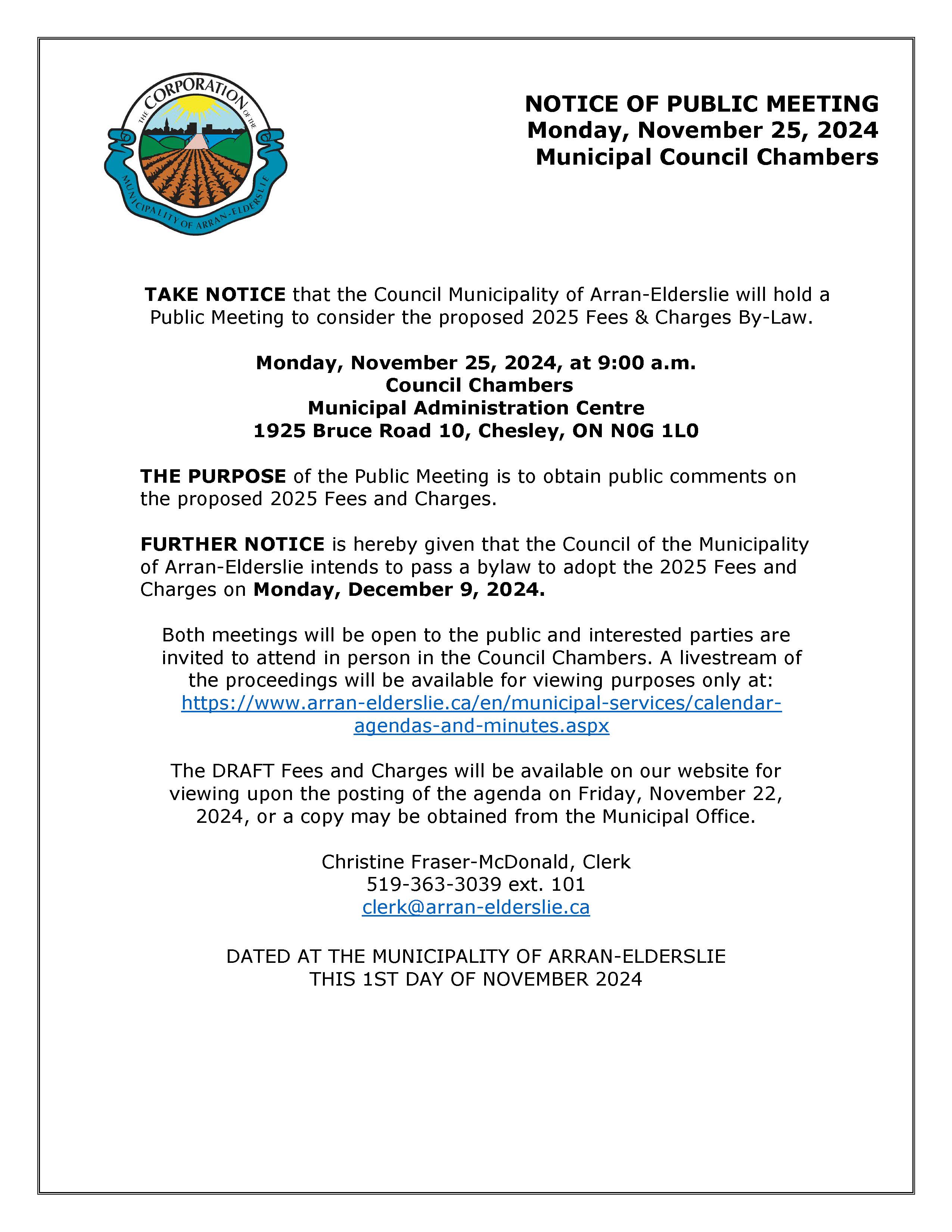 Notice of Public Meeting - DRAFT Fees and Charges Bylaw