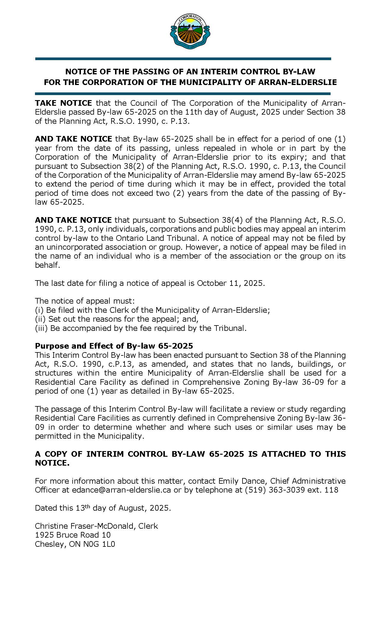Notice of the Passing of an Interim Control By-law
