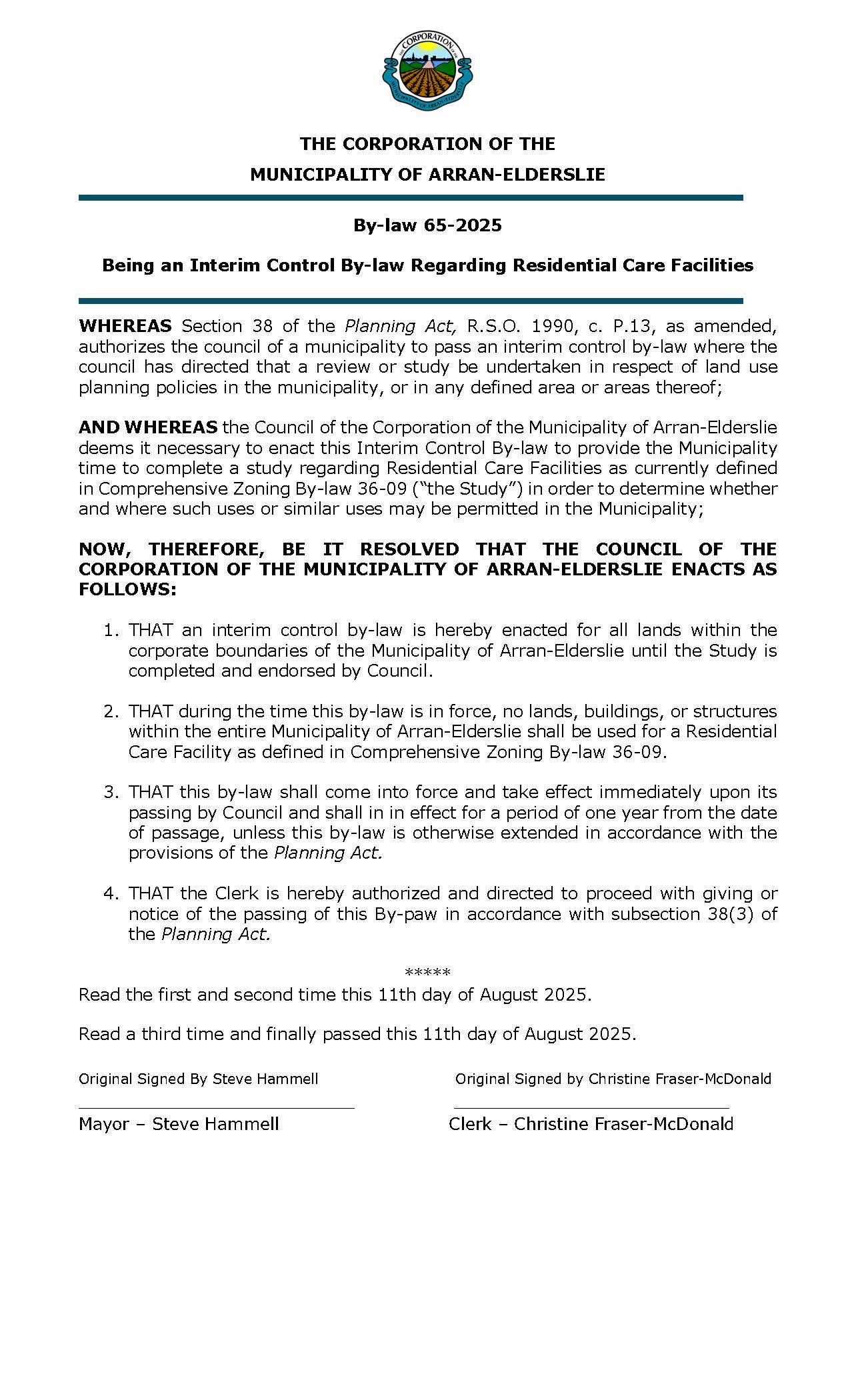 Being an Interim Control By-law Regarding Residential Care Facilities