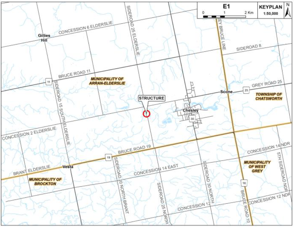 The bridge, located on Sideroad 25, Elderslie between Concession 2, Elderslie and Bruce County Rd 19 requires immediate rehabilitation to repairs to the floor beams and concrete deck to maintain the 10 tonne load limit.